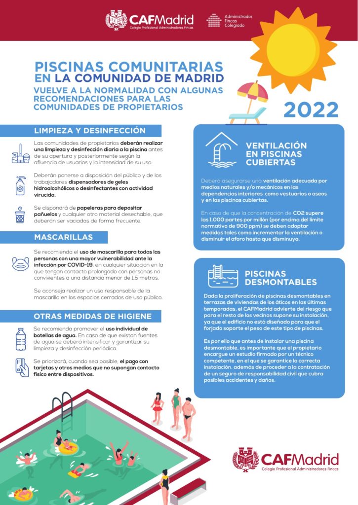 Madrid, 1 de junio de 2022.- Ante la próxima apertura de la temporada de piscina en las comunidades de propietarios, el Colegio de Administradores de Fincas de Madrid (CAFMadrid) informa que hasta hace unos días, las piscinas de uso colectivo deportivo/recreativo debían cumplir con todo lo indicado en la Orden 1244/2021, de 1 de octubre, de la Consejería de Sanidad, por la que se establecían medidas preventivas para hacer frente a la crisis sanitaria ocasionada por la COVID-19.