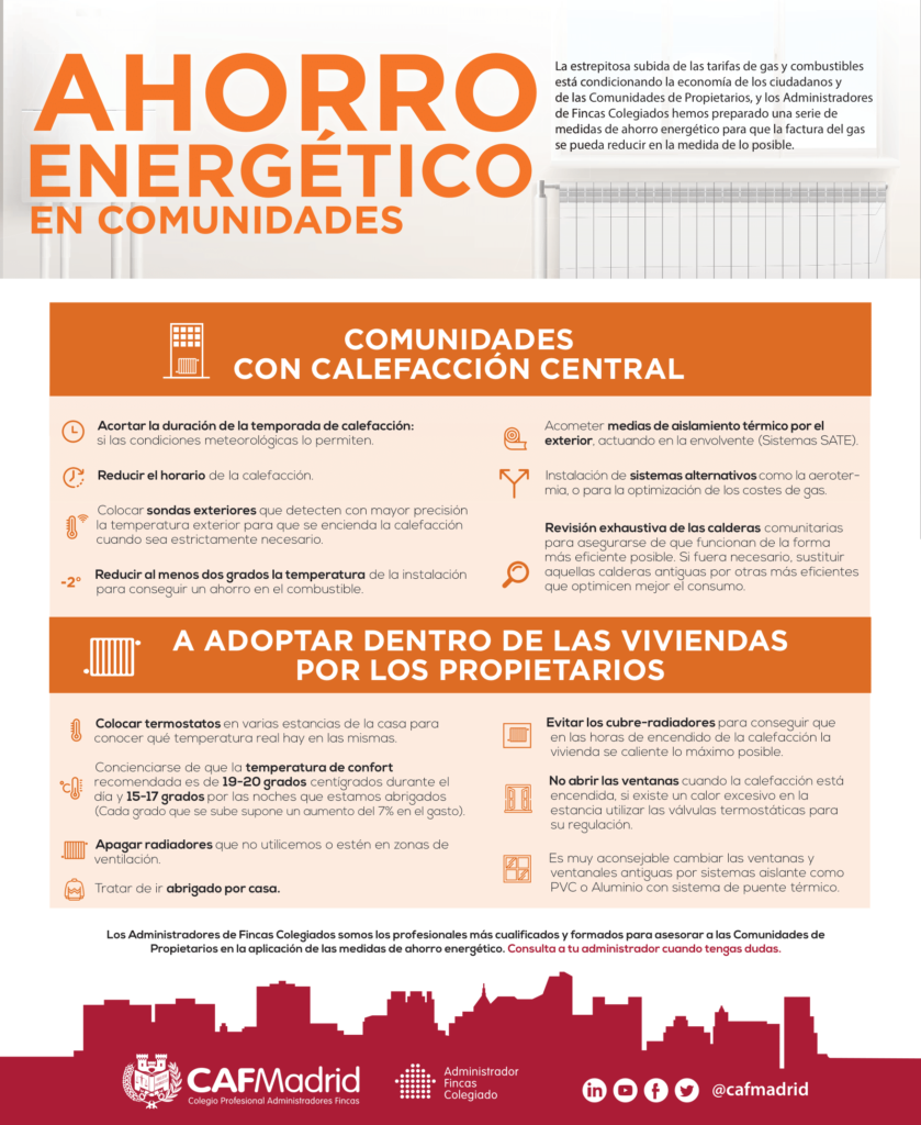 Madrid, 6 de octubre de 2022.- La escalada de precios del gas y el resto de combustibles está afectando especialmente a las comunidades de propietarios con calefacción central. El Colegio de Administradores de Fincas de Madrid -CAFMadrid- ha preparado una campaña informativa para que los administradores de fincas colegiados puedan hacer llegar a las comunidades de propietarios madrileñas con calderas de gas una serie de medidas de ahorro energético con el fin de tratar de reducir la factura en la medida de lo posible.